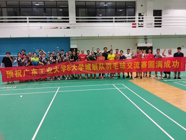 在中国共产党成立100周年之际,为响应国家建设健康中国的号召,2021年5月10日,学校羽毛球兴趣小组在大学城校区举办了“广东工业大学&大学城联队羽毛球交流赛”活动。学校18名教工羽毛球队员和大学城9个单位的特邀代表组成的联队(大学城管委会、街道办、交警中队、华师大、广大附中、华师附小、省中医院、中交四航局、自行车馆)进行了交流赛。